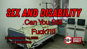 Thank you, Jizzy, for putting that in the proper spot in the Whore School Discord. Okay, so sex, sexuality and disability. If you’ve ever had a short term disability, you’ve gotten a little taste of what it could be like if you had this issue for longer than, you know, broken leg.